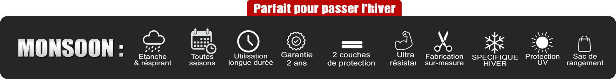 Pour mieux comprendre les différences entre nos modèles, consultez notre comparatif des bâches de protection sur mesure , puis découvrez en détail chaque gamme : Voyager, Stormforce, Monsoon ou Sahara.