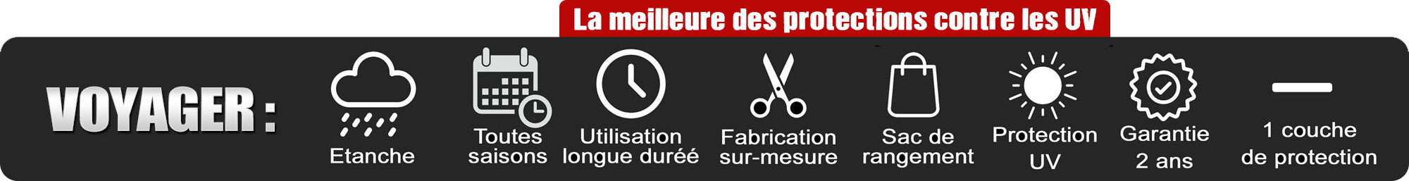 Sa matière robuste offre une grande résistance à la déchirure et reste performante même en températures extrêmes. Polyvalente et durable, la Voyager accompagne votre véhicule au quotidien comme lors des périodes d’immobilisation prolongée, pour une alliance réussie entre sécurité, confort d’utilisation et finition premium.