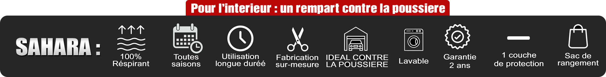 Entièrement respirante, la Sahara permet à l’humidité de s’évacuer, limitant ainsi la condensation. Elle est lavable, anti-rayures, ne rétrécit pas et convient aussi bien pour un stockage longue durée que pour une utilisation plus ponctuelle. Une solution idéale pour conjuguer propreté, protection intérieure et finition premium.